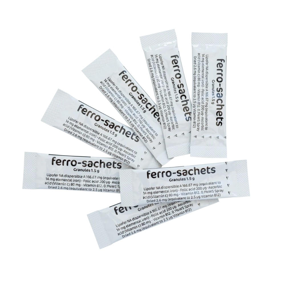 Ferro-Sachets® 費羅補血粉肌鐵素是一種膳食補充劑,含有以脂質體形式微膠囊化的鐵質。 成分能直接被細胞吸收,並減少胃部不適、便秘等副作用。相比一般補鐵產品吸收率更高,高達80%。配合當中葉酸、維他命C及B12,有助鐵質吸收加快紅血球形成,特別適合產後、孕期或備孕女性。